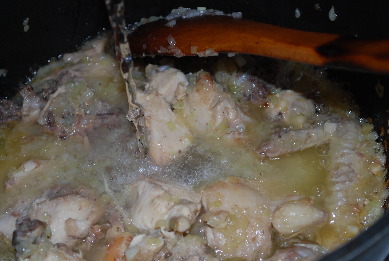 Preparation: Cut the chicken into medium to large pieces and add, together with 5 tbs of oil (3-4 if the chicken is fatty) to a deep pot. Cook for 15 minutes on a low to medium heat.