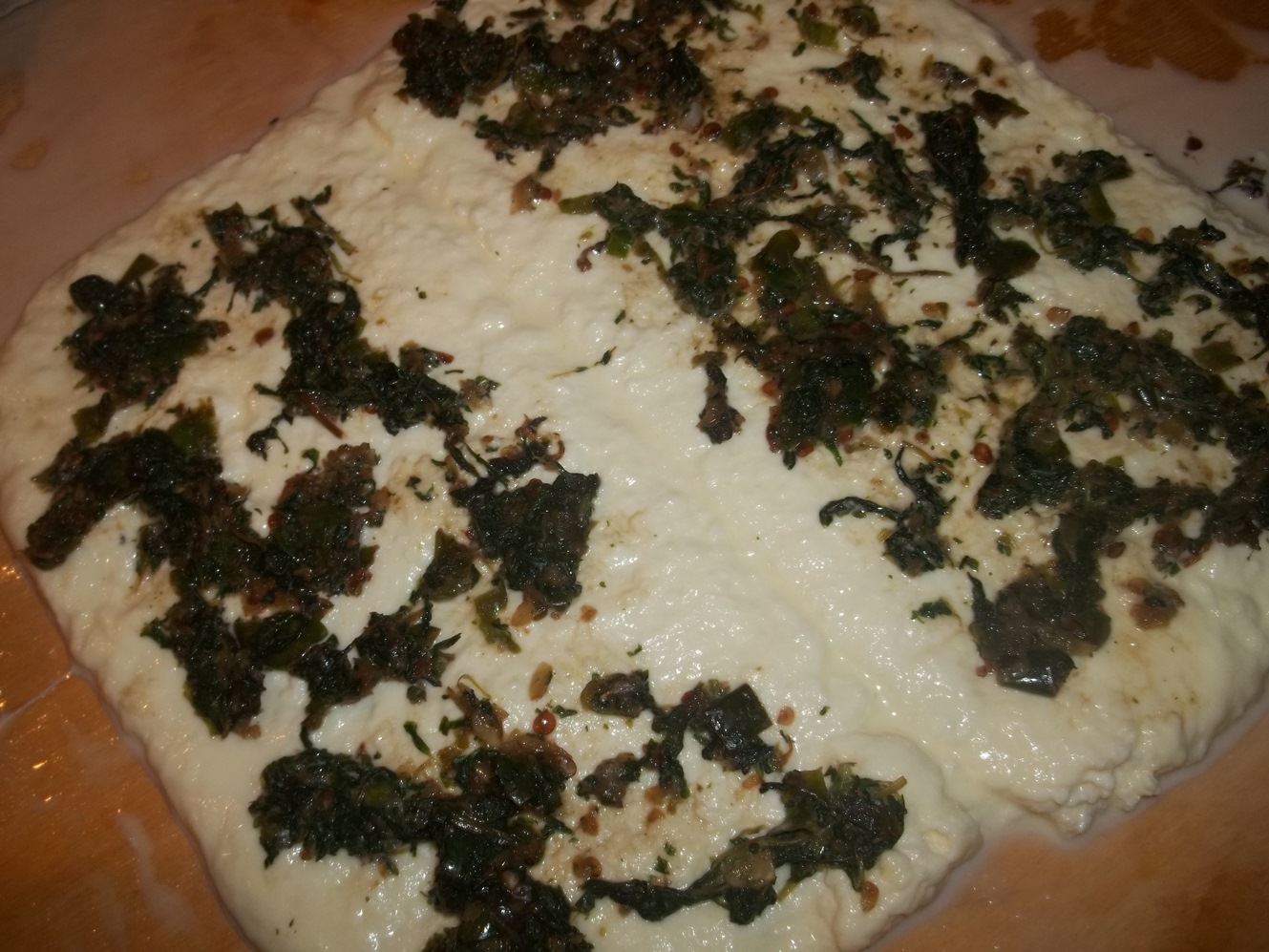 Add the remaining half of the crushed mint, peppers and garlic to the surface of the rolled out cheese.
