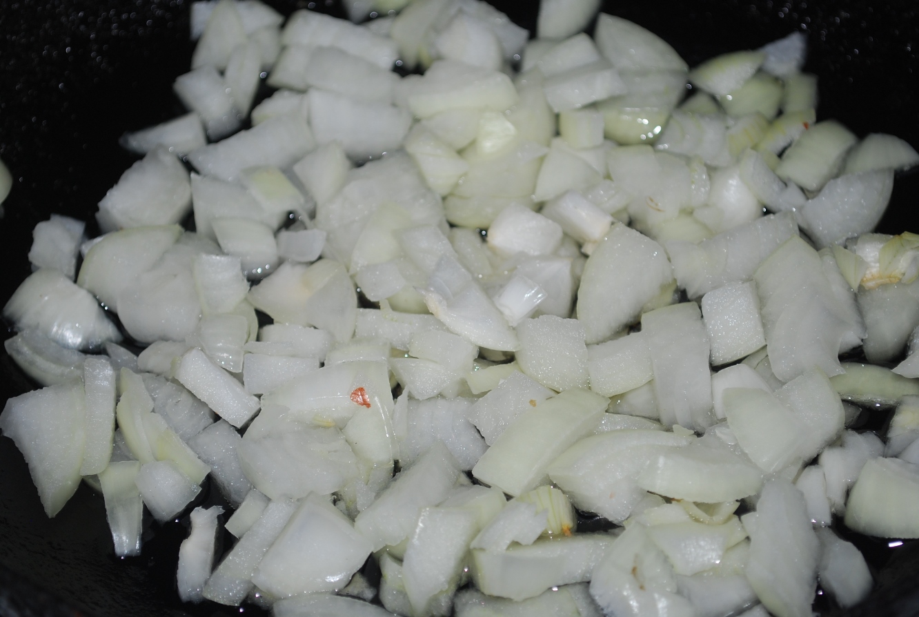 Chop the onions and add to a pan with 5 tbs of oil. Fry on a low to medium heat for 2 minutes, stirring occasionally.