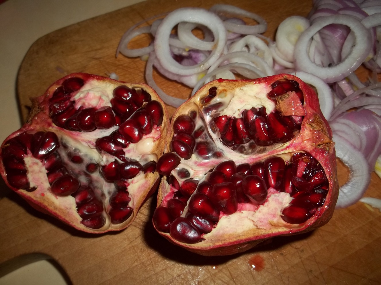 Ingredients: 1.2 kilos of pork, 1 white onion, 1 red onion, 5 tbs of vinegar, 1 medium sized pomegranate, 2 bay leaves, 1 tbs of ajika (see recipe here), and salt (amount dependent upon personal preference).