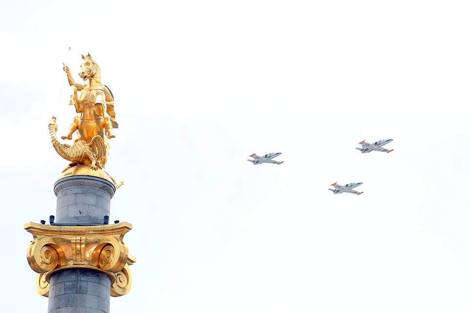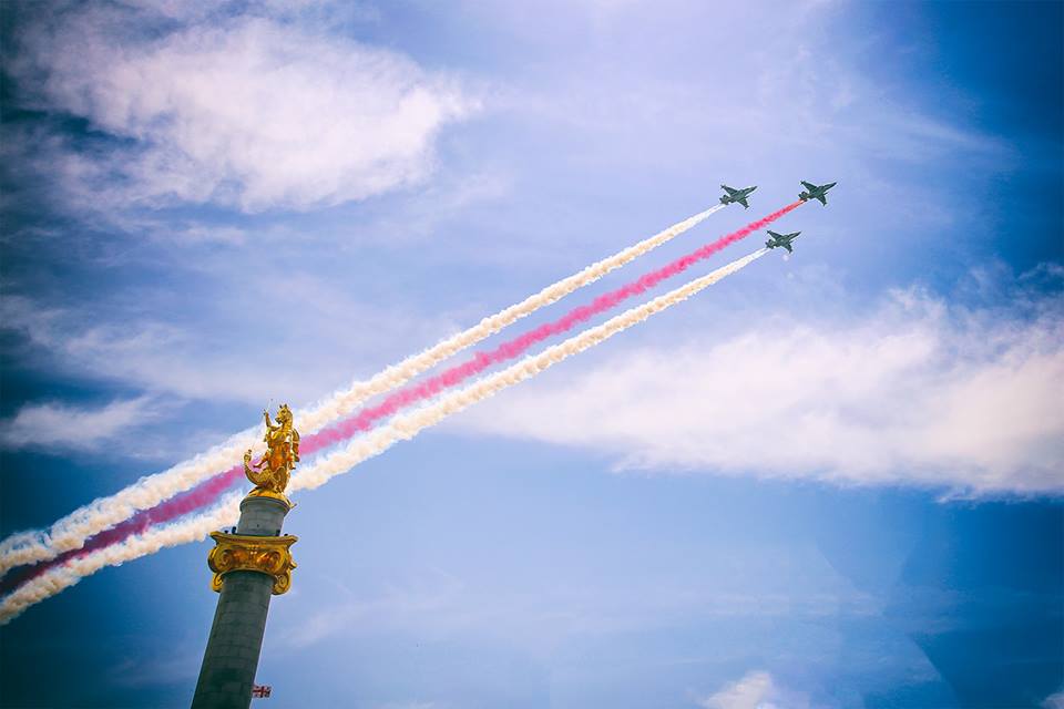 Jets flying past the Freedom Monument in the center of Tbilisi on Independence Day. Photo courtesy of Tbilisi City Hall
