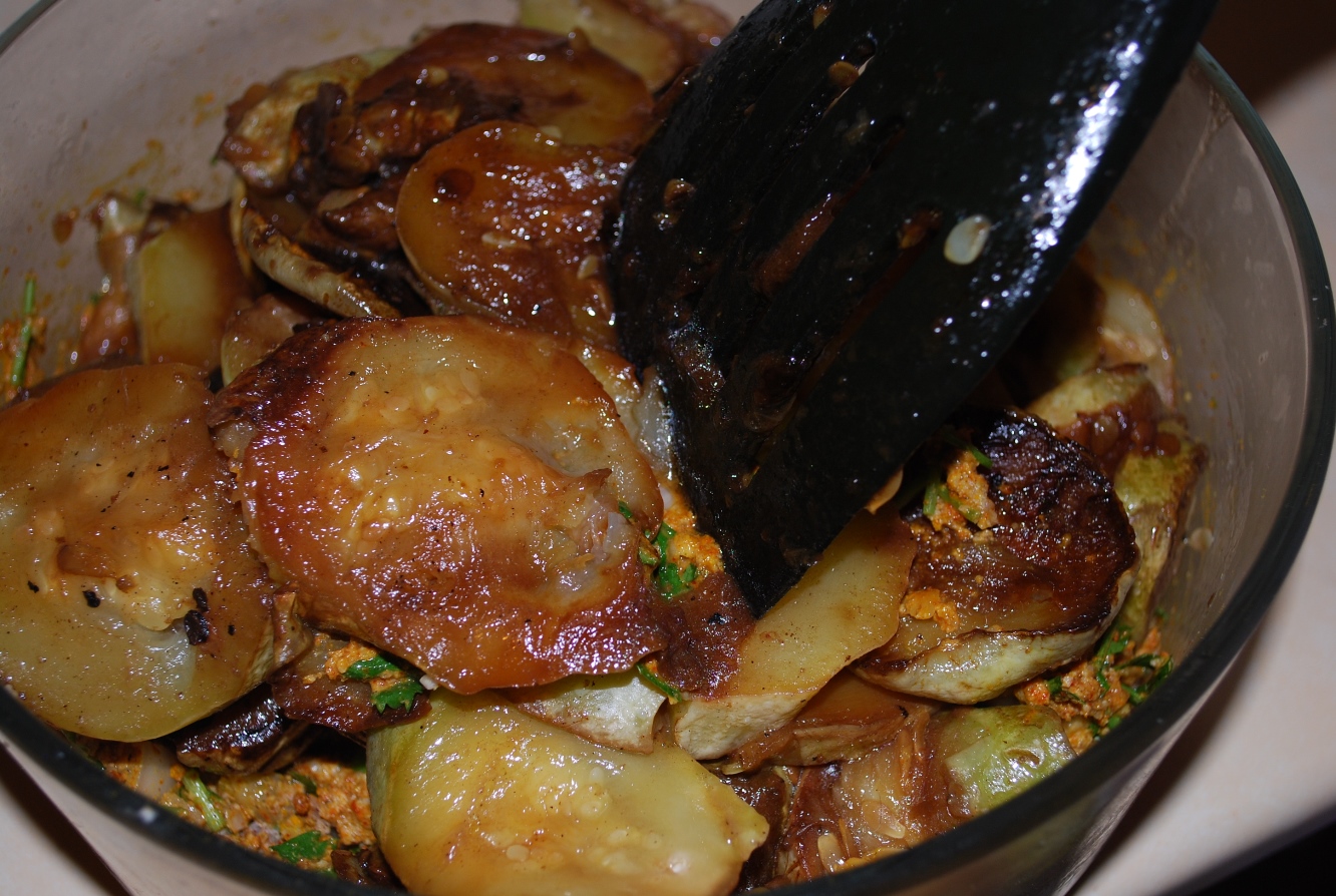 Ingredients: 1 kilo of zucchini, 400 grams of walnuts, 50 grams of fresh green coriander, 50 grams of fresh parsley, 1 medium sized onion, 3 large cloves of garlic, 1 or 2 hot green peppers (optional), three-quarter tsp of dried coriander, three-quarter tsp of dried marigold, half tsp of blue fenugreek, 1 level tsp of hot red pepper (or less, dependent upon taste), 10 tbs of vegetable oil (for frying zucchini), 50 ml of boiled, cooled water, 3 tbs of white wine vinegar, and salt (according to taste).