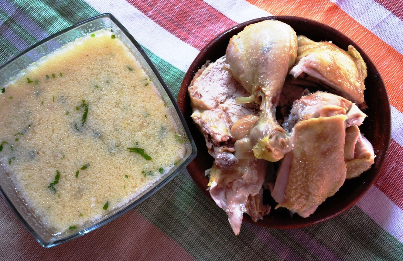 Ingredients: 1 whole chicken, 5 eggs, 2 medium sized onions, 3 tbs of flour, 2 bay leaves, 70 grams of fresh coriander, 3 tbs of white wine vinegar, 3 liters of water, and salt (amount dependent upon personal preference),